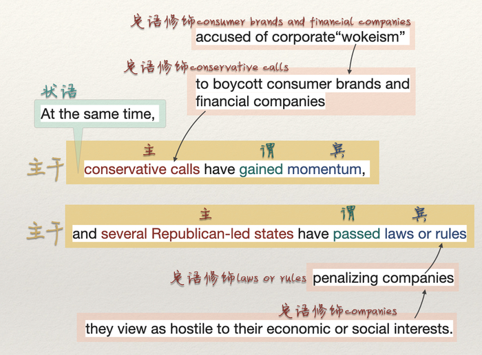 参考译文:与此同时,保守派呼吁抵制那些被指控为企业“觉醒主义”的消费品牌和金融企业,他们的呼声越来越高,几个共和党控制的州已通过法规,来惩罚他们认为对其经济或社会利益不友好的企业。