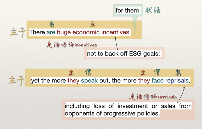 参考译文:他们有巨大的经济动机不放弃“环境、社会和治理”目标:然而,他们越多发声,面临的报复就越多,包括失去来自反对进步政策的人士的投资或销量。