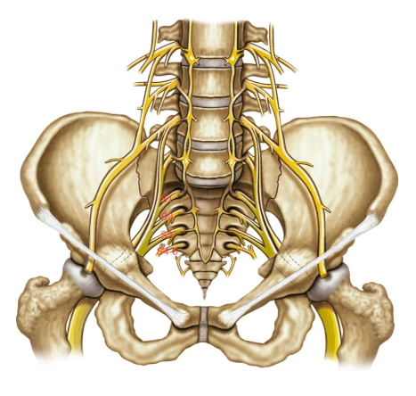 骶骨脊索瘤切除时,为了降低复发率往往会对肿瘤进行完整切除,这样势必会切除肿瘤包裹的骶神经根(下图)。神经根的损伤会导致相应功能丧失,其中最主要的就是大小便功能和性功能障碍。详细的术前计划,可以预测术后功能整体的保留或丢失程度。即使相应功能受损,术后通过康复锻炼会有很大程度改善。