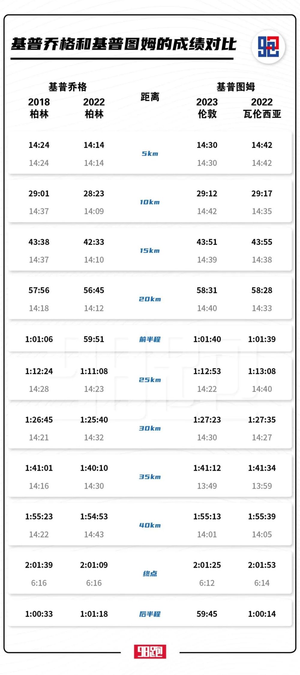去年12月,基普图姆在瓦伦西亚创下1:00:14的马拉松史上最快后半程——此前的纪录由基普乔格保持,2018年,他在柏林首次创造世界纪录时,后半程用时1:00:33。