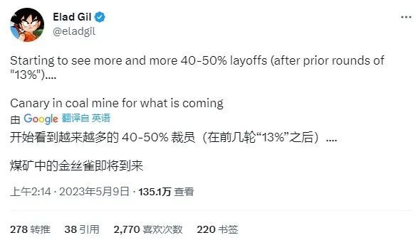 “未来企业裁员不止13%,甚至可能高达40%—50%!”硅谷投资人Elad Gil在5月9日发推预测未来的企业动向。马斯克跑评论区补了一刀:“我希望你是错的,但是我怀疑你是对的。”