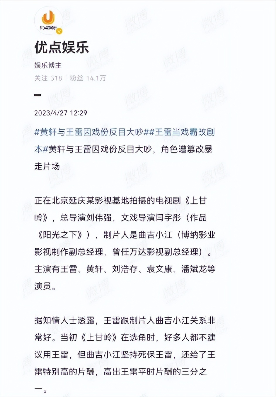 据该号所说,这件事情发生在正在拍摄的《上甘岭》剧组,传闻中的戏霸是王雷,被抢占了戏份的则是黄轩。