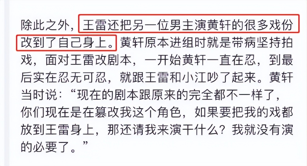 而王雷到了剧组之后就“大展拳脚”,将原本的剧本改得面目全非,甚至将原属于黄轩的戏都改到了自己身上。