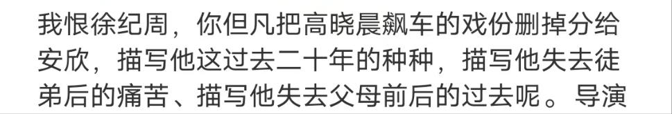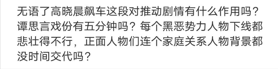 而成年高晓晨的戏份包括一些毫无意义的飙车戏在内,让观众觉得删了也无妨,很多人在看《狂飙》都是选择性地跳过高晓晨的戏。