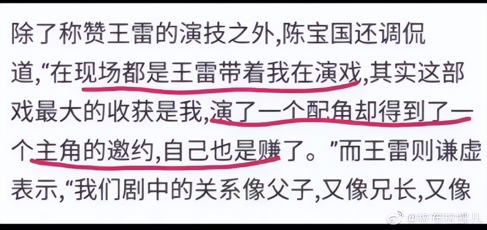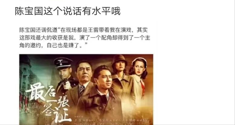 陈宝国接受采访时,更是说了这样一句话:“在现场都是王雷带着我演戏,我演了一个配角却得到了主角的邀约,是我赚了。”