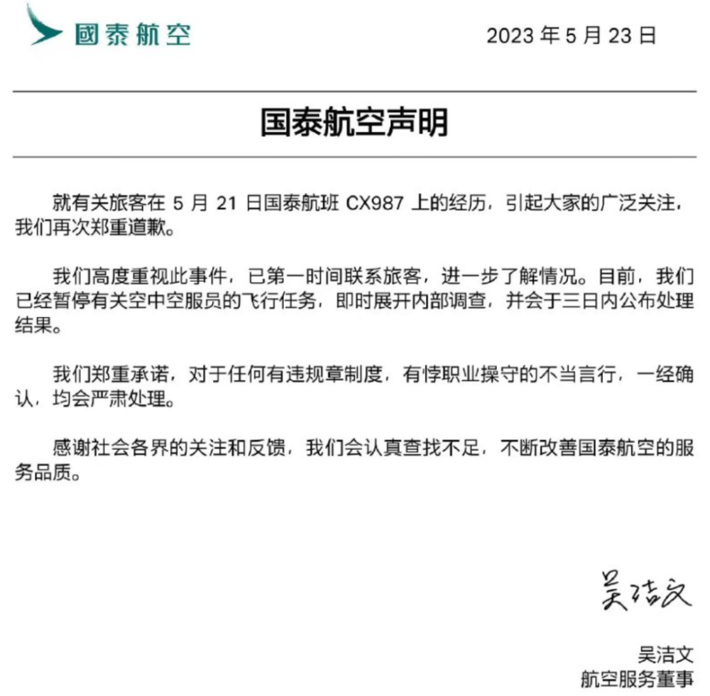 5月22日晚,国泰航空发布声明:已知悉此事,深表歉意,会进行严肃调查处理。