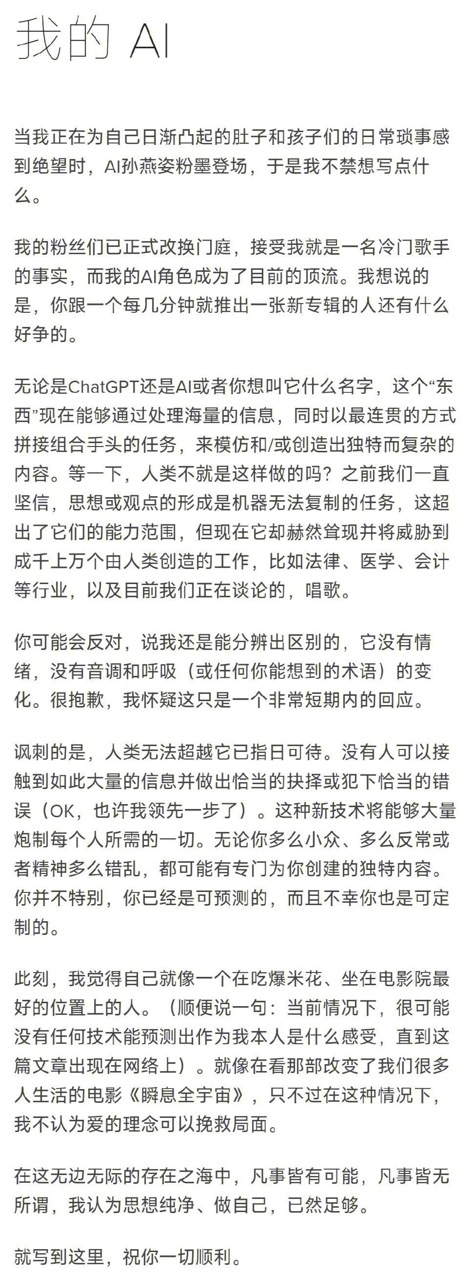 《孙燕姿回应“AI孙燕姿” :思想纯净、做自己,已然足够》三言科技