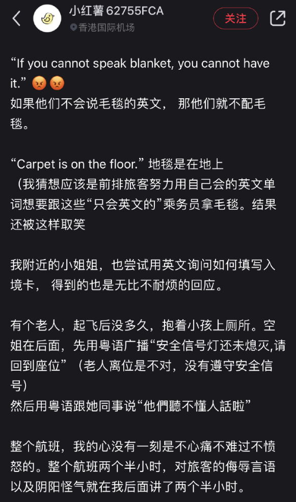 昨晚火了一则关于“国泰航空歧视非英语乘客”的实名举报。