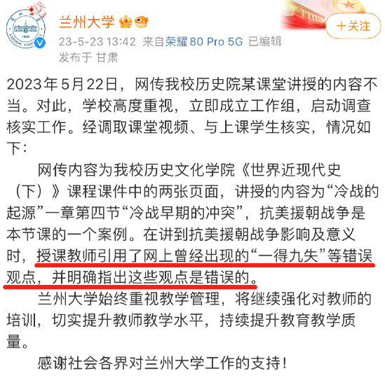 《兰州大学回应网传教师抹黑抗美援朝:该教师明确指出这些观点是错误的》Vista看天下