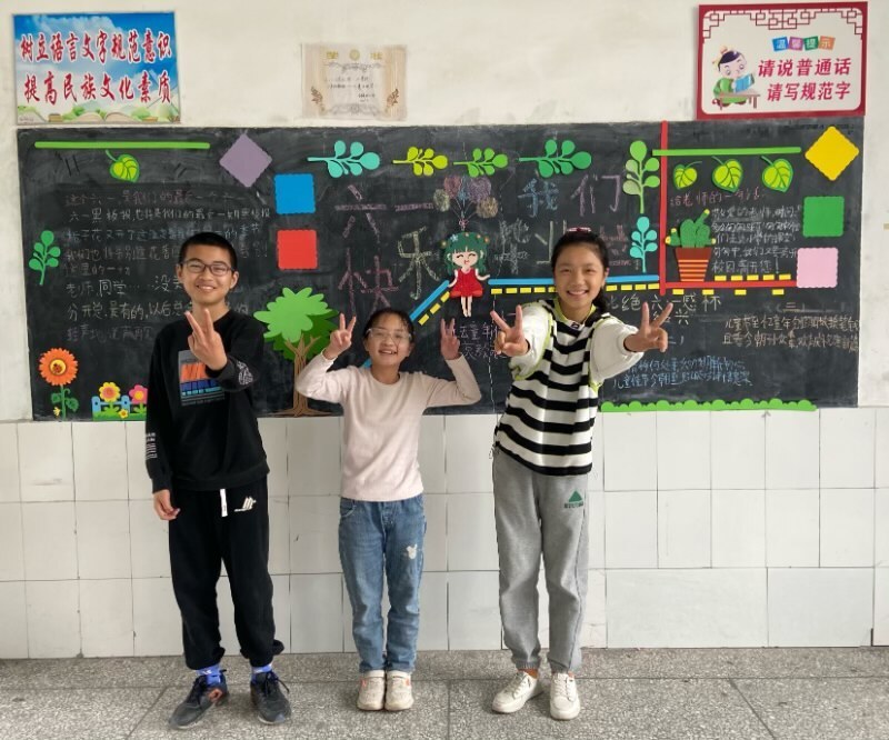 还有一些小快乐已经融入三人日常的默契与“吐槽”中。比如劳动扫除时,张天成负责擦黑板、打一桶水并提到2楼的教室,供女生们拖地。更新黑板报时,三人一人负责一部分内容。他(她)们合力完成的最新一期黑板报主题为儿童节和毕业。