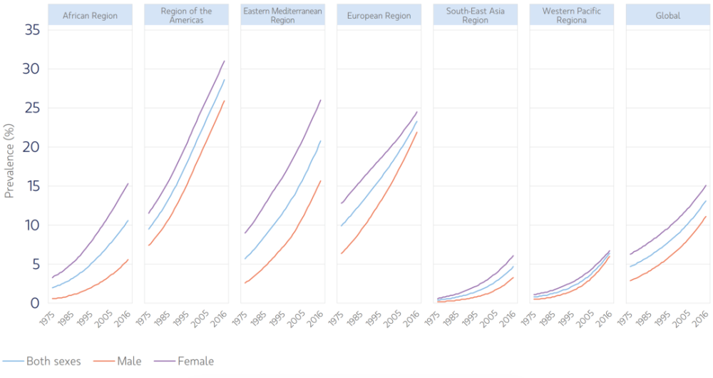 2000年,全球成人肥胖率为8.7%,这一数字到2016年增长为13.1%,增幅最大的是东南亚地区(从2000年的1.9%上升到2016年的4.7%)及西太平洋地区(从2.7%上升到6.4%)。