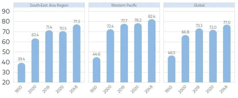 全球范围来讲,1950年出生的人,预期寿命是46.5岁,2019年约为73.0岁;预计到2048年,预期寿命达到77.0岁,西太平洋地区的预期寿命估计最高,可达到82.7岁。