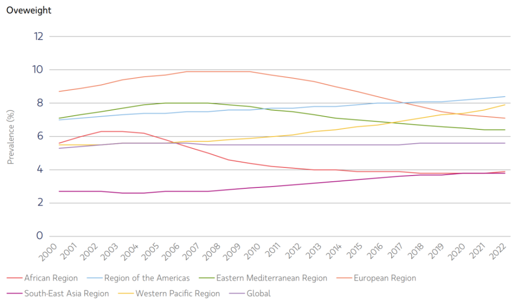 虽然全球5岁以下儿童超重流行率似乎停滞不前,但自2000年以来,西太平洋区域、美洲区域和东南亚区域的儿童超重/肥胖流行率均有所上升。
