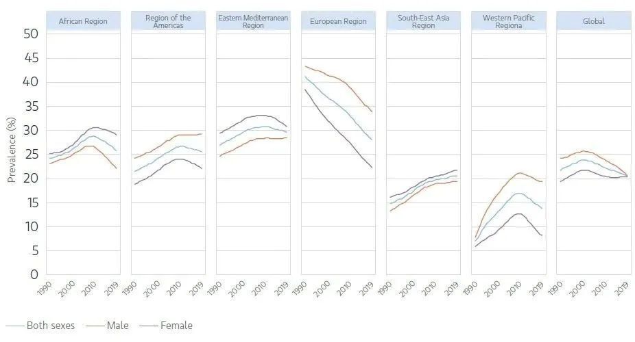 全球范围内,自1990年以来,30-79岁成人高血压的年龄标化患病率一直在上升,在2009年左右达到峰值,此后又下降,到2019年为33.1%。全球大部分地区观察到类似的钟形曲线,但东南亚和欧洲除外,东南亚地区的高血压患病率自1990年以来持续上升,欧洲则持续下降。