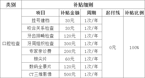 2、常规补贴:在定点口腔单位可享全套口腔检查,包含挂号费、专家诊疗费、方案设计费、数字全景片检查、3D数字影像CT等费用全额补贴,即全部免费。