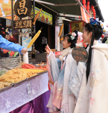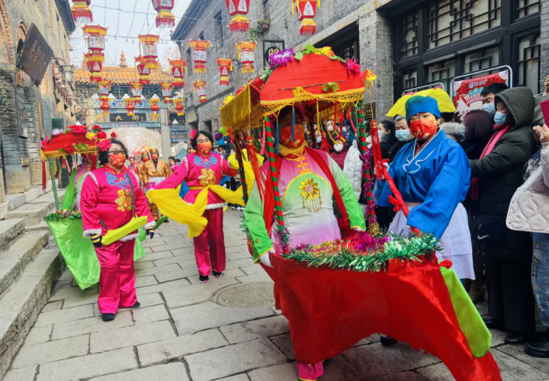 预约通道恢复畅通,民俗体验不断升级,前来游玩的游客们,大年初三的快乐,是周村古商城给的。看!闹舞狮、划旱船、扭秧歌、赶毛驴、美丽的汉服小姐姐又开始在街道散播欢乐啦!