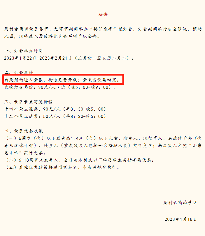 春节假期,被山东多个景点免费开放的信息刷屏。春节前夕,周村古商城景区也即时发布《2023年春节、元宵节入园公告》,“提前预约,街道免费开放”得到市民及游客朋友的认可和赞赏。