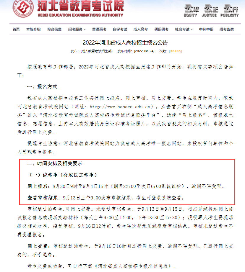 昨晚十点河北省教育考试院正式公布了河北省2022年成人高考的网上报名时间和相关科目的考试时间!具体详见下文!