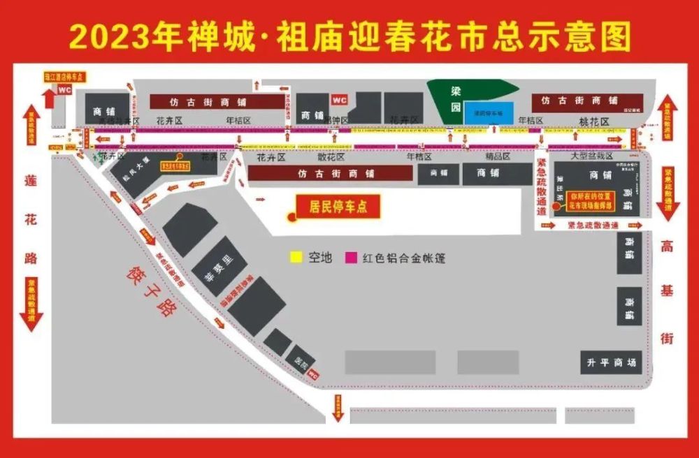 勒流社区迎春花市分别设立年花年桔摆卖区、枝花散花摆卖区、桃花摆卖区、精品杂货摆卖区及公益义卖区共65个摊位。前往的市民可将车辆停放在周边停车位或君王酒店停车场。