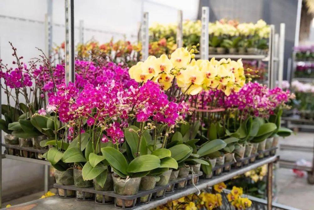 位于三水区云东海街道的绿聚隆花卉种苗有限公司蝴蝶兰种植基地内,待售的蝴蝶兰被整齐摆放。