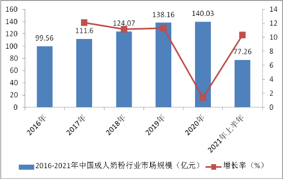 图表:2016-2021年中国成人奶粉行业市场规模