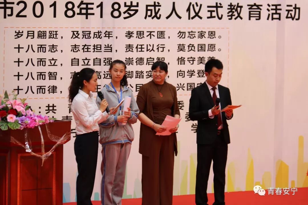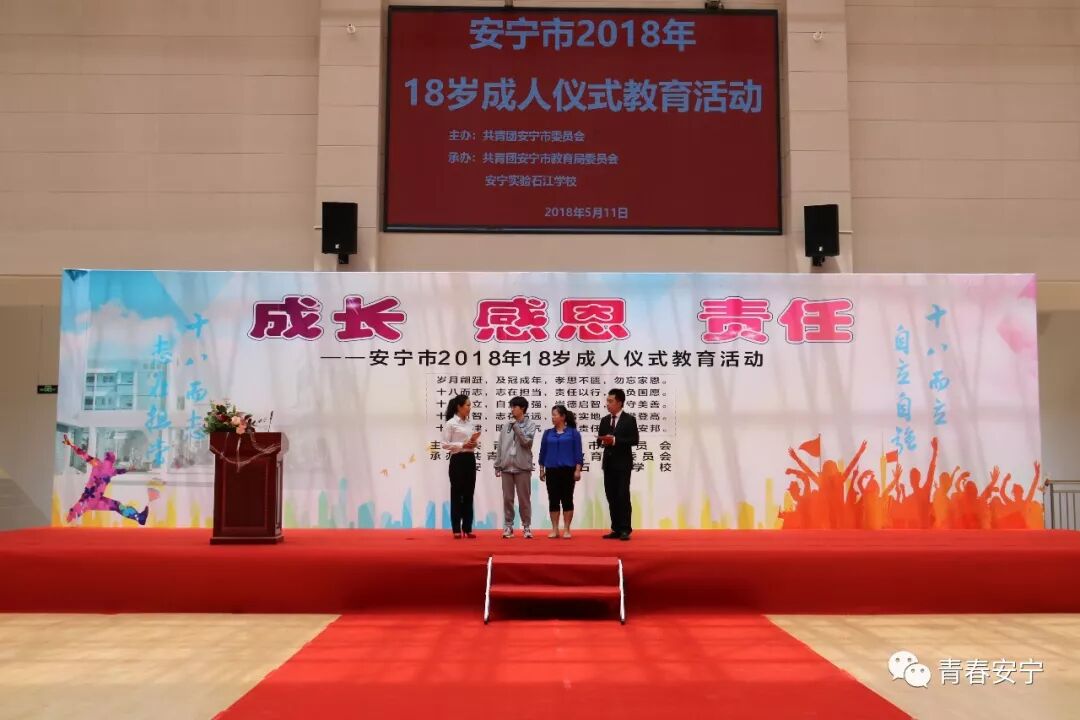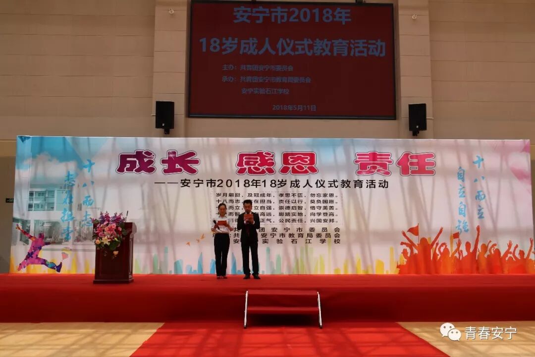2018年5月11日下午,共青团安宁市委在安宁实验石江学校举办了以“成长 感恩 责任”为主题的安宁市2018年18岁成人仪式教育活动。