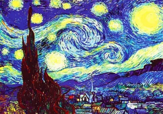 请看第一幅画,梵高的《星月夜》,又译作《星夜》,1889年梵高于在荷兰圣雷米的一家精神病院里创作的一幅著名油画作品。有种普遍的说法,由于这是梵高在精神病时期所作,世人普遍认为这是梵高想象出来的美妙情景。这幅画中呈现两种线条风格,一是歪曲的长线,一是破碎的短线。二者交互运用,使画面呈现眩目的奇幻景象。在构图上,骚动的天空与平静的村落形成对比。火焰则与横向的山脉,天空达成视觉上的平衡。这不是现实的星空,写实的星空根本无法表达梵高的精神世界,因此它必须变形,世界必须屈从于画家精神的表达。它的奇异与神秘,让人类得以拥有如此奇异瑰丽的星空。它比写实更能唤起和容纳无数人仰望星空时心中的那种震撼、惊奇、神秘和遐想。