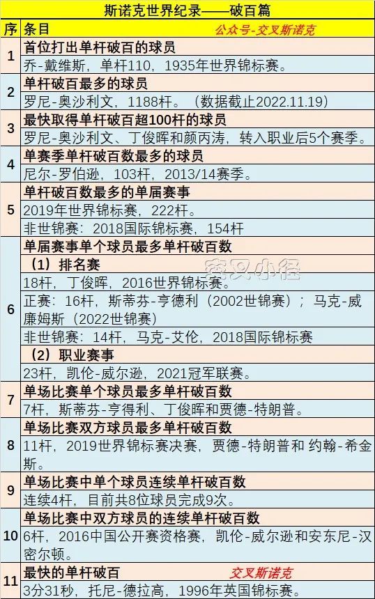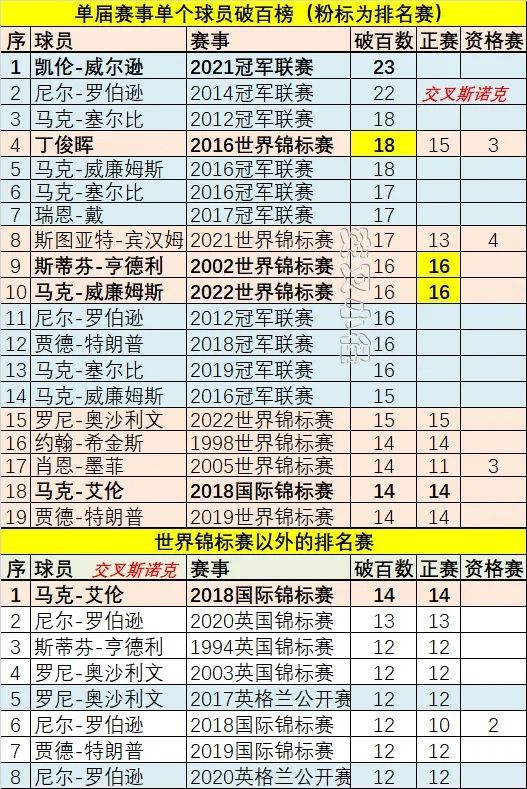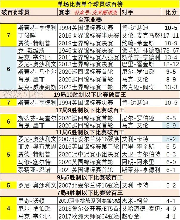 注:此为邀请赛版的冠军联赛,球员理论上最多可以参加8组比赛。由于其属联赛性质,所以这个纪录总感觉不是非常正宗。之前的纪录是2014年冠军联赛,尼尔-罗伯逊通过四组比赛,刷出22杆破百。2021年冠军联赛,凯伦-威尔逊,通过5组比赛,23杆破百刷新纪录。