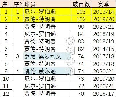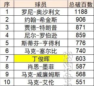 另外,可以看看那些在单届职业赛事中高效率破百的球员,如: