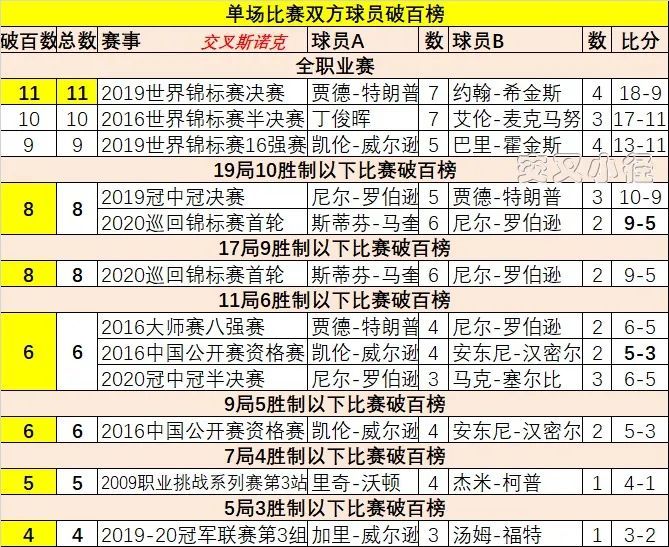 注:这是双方球员的贡献。这个纪录也是世锦赛的专利。贾德-特朗普18-9胜。