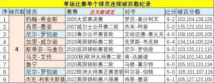 另外值得一提的是,斯蒂芬-马奎尔在2004年英国公开赛时连续打出5杆破百,不过这5杆分别是在1/4决赛的最后三局和半决赛的前两局完成。