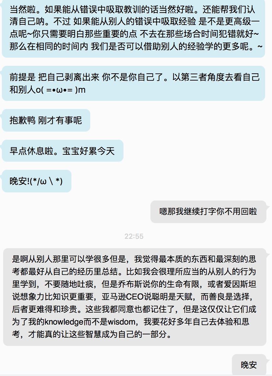 最后是,错误真的是很棒的素材,犯错迫使你思考,认真思考一些其它情况下根本不会想的问题,从而改变你,让你变得更好。我在想,就像一个公司的目标是让产品更好让这更好那更好,会不会人活着的目的(之一)也是让自己变得更好?如果是,错误一般都会让人变得更优秀,而错误的影响最终都会消除(可能会要很久),等错误的影响消除了,剩下来的是那个人变得优秀了很多,那犯错其实是一件好事?我越来越觉得是我犯的一些错误,让我和别人不同,让我在一些方面不会和别人一样平庸。