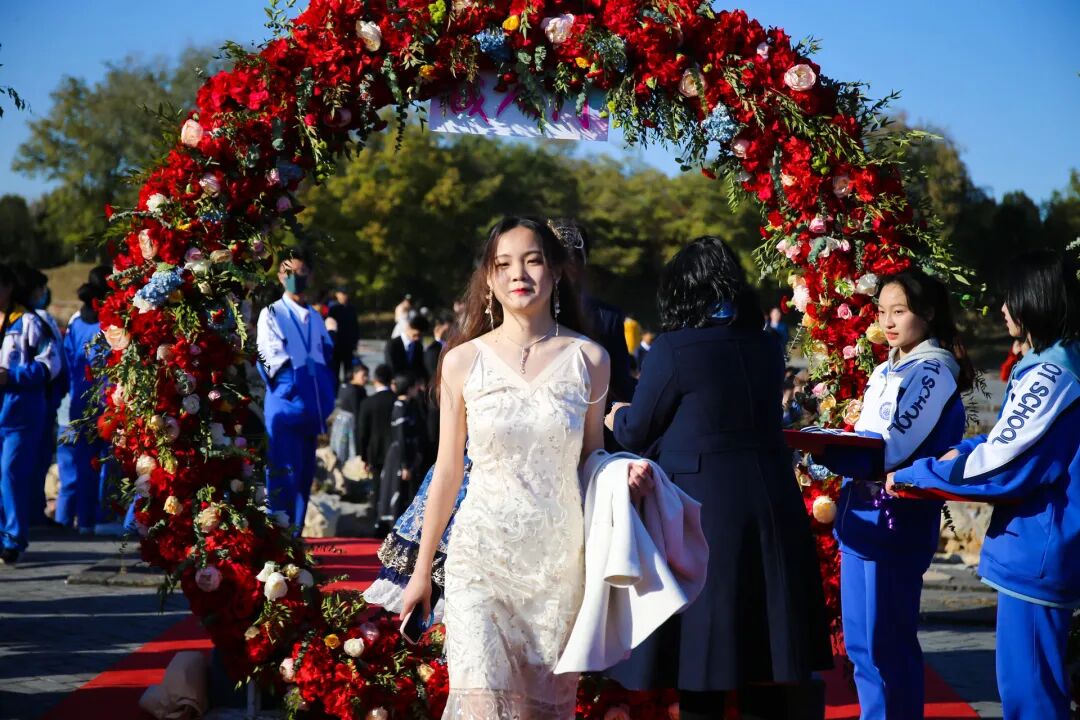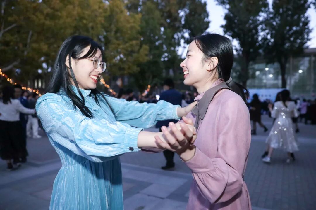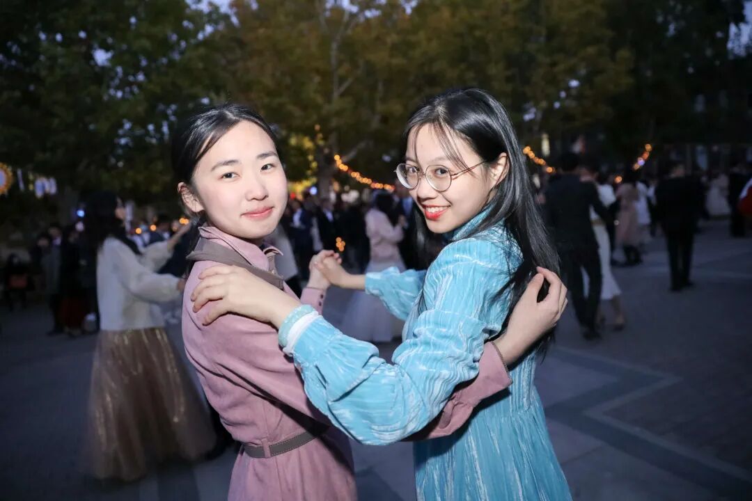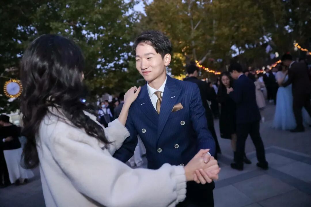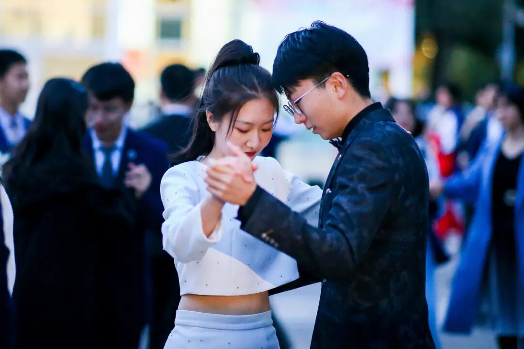 成人礼之后,大家回到喷泉广场,盛装出席主题舞会。伴随着一首首优美的舞曲,师生共同翩翩起舞。