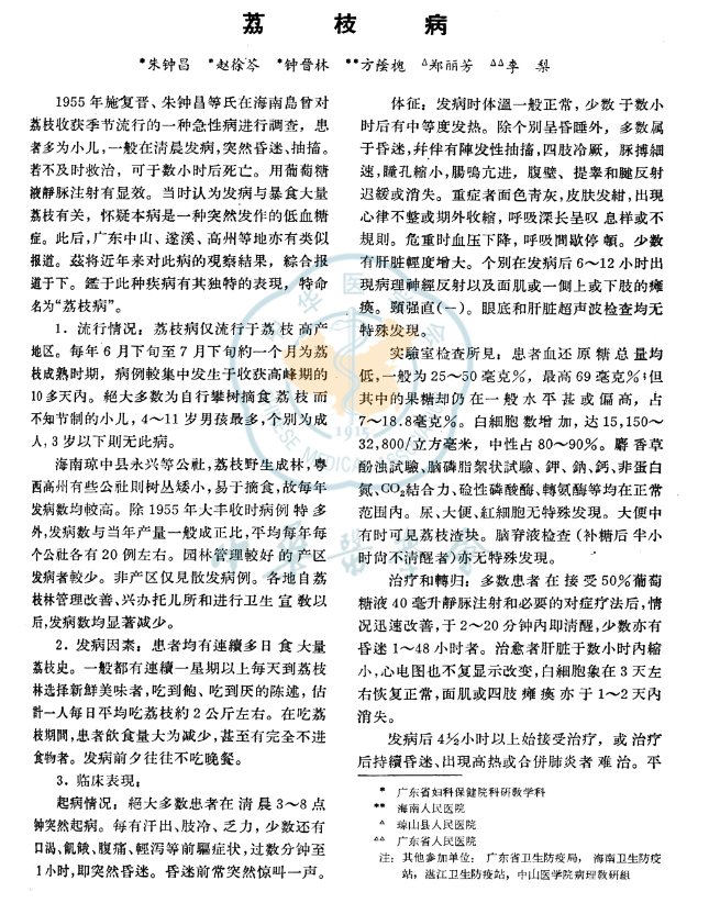 最早公开发表的有关荔枝病的文献应该是1965年发表在《中华医学杂志》上的调查研究报告《荔枝病》。