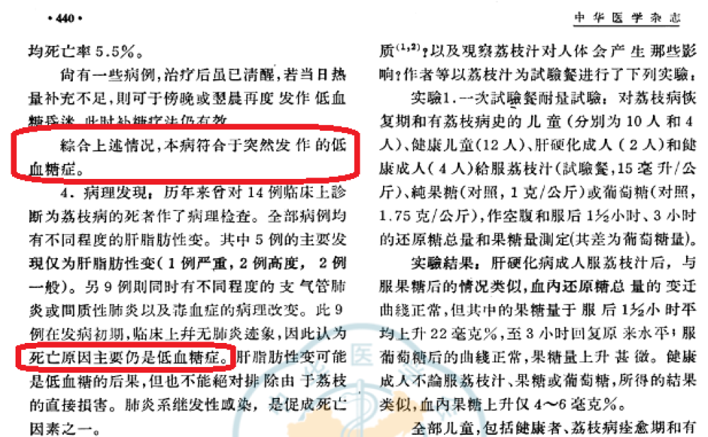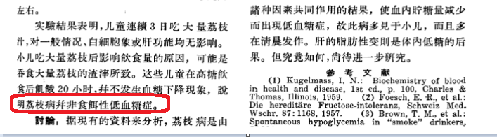 也就是说,早在60年前,我国的研究人员就知道,荔枝病并不是像今天的伪科普说的那样,是由荔枝中高含量果糖通过刺激胰岛素分泌而产生的低血糖反应。