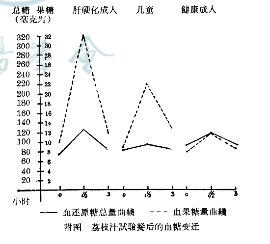 结果,患有肝硬化的成年人和儿童(不论有没有发生过荔枝病),服用荔枝汁和果糖后,血液中果糖浓度在1.5小时出现一个高峰,3小时后恢复到试验前水平。