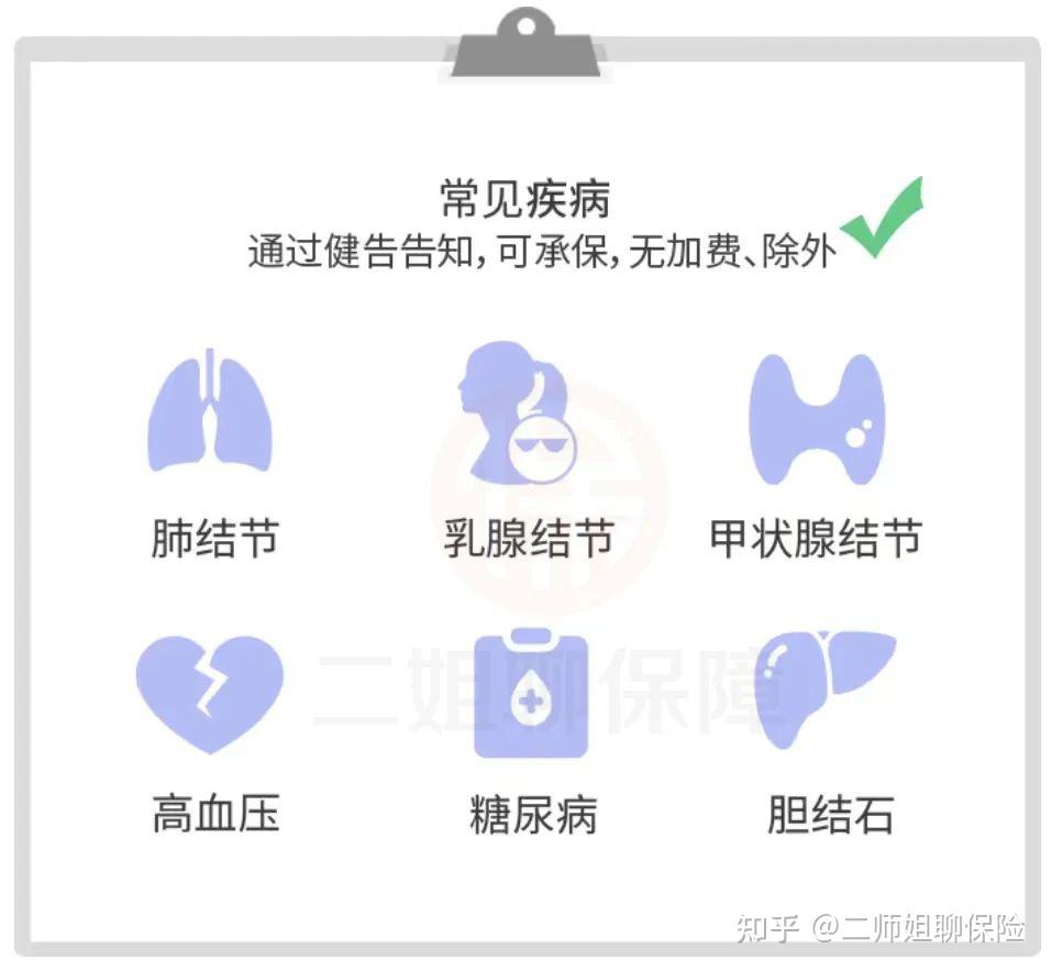 另外肺结节、甲状腺结节、肺结节、乳腺结节、乙肝大小三阳、高血压、糖尿病等常见病,只要通过健康告知,就可以投保。