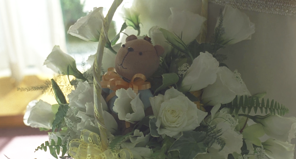 平介上前,扶着女儿的肩膀,却看见女儿手里的花篮里装着一个玩具小熊。