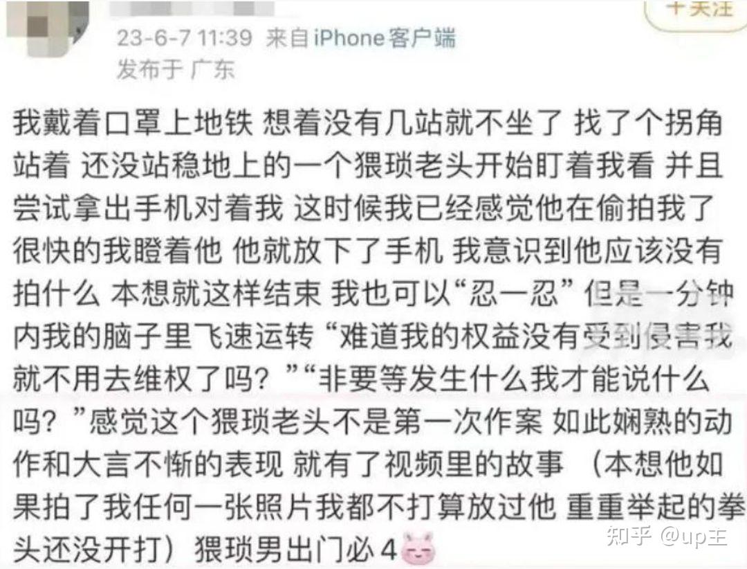据报道,6月7日,广州地铁8号线上,女子看见一大叔蹲着玩手机,怀疑对方偷拍自己,要求检查相册,大叔让她检查自证清白。随后,该女子在网络曝光大叔是猥琐男,称手法娴熟不是第一次作案,并表示既然没有偷拍,他为什么不为自己发声。