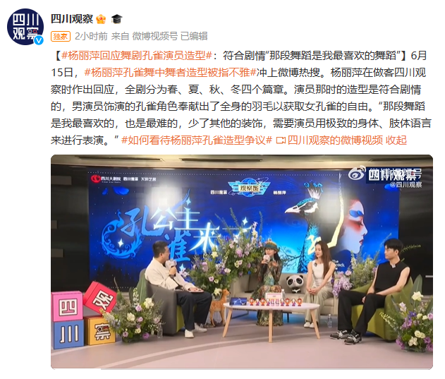 6月15日,杨丽萍在做客四川观察时作出回应,全剧分为春、夏、秋、冬四个篇章。演员那时的造型是符合剧情的,男演员饰演的孔雀角色奉献出了全身的羽毛以获取女孔雀的自由。“那段舞蹈是我最喜欢的,也是最难的,少了其他的装饰,需要演员用极致的身体、肢体语言来进行表演。”