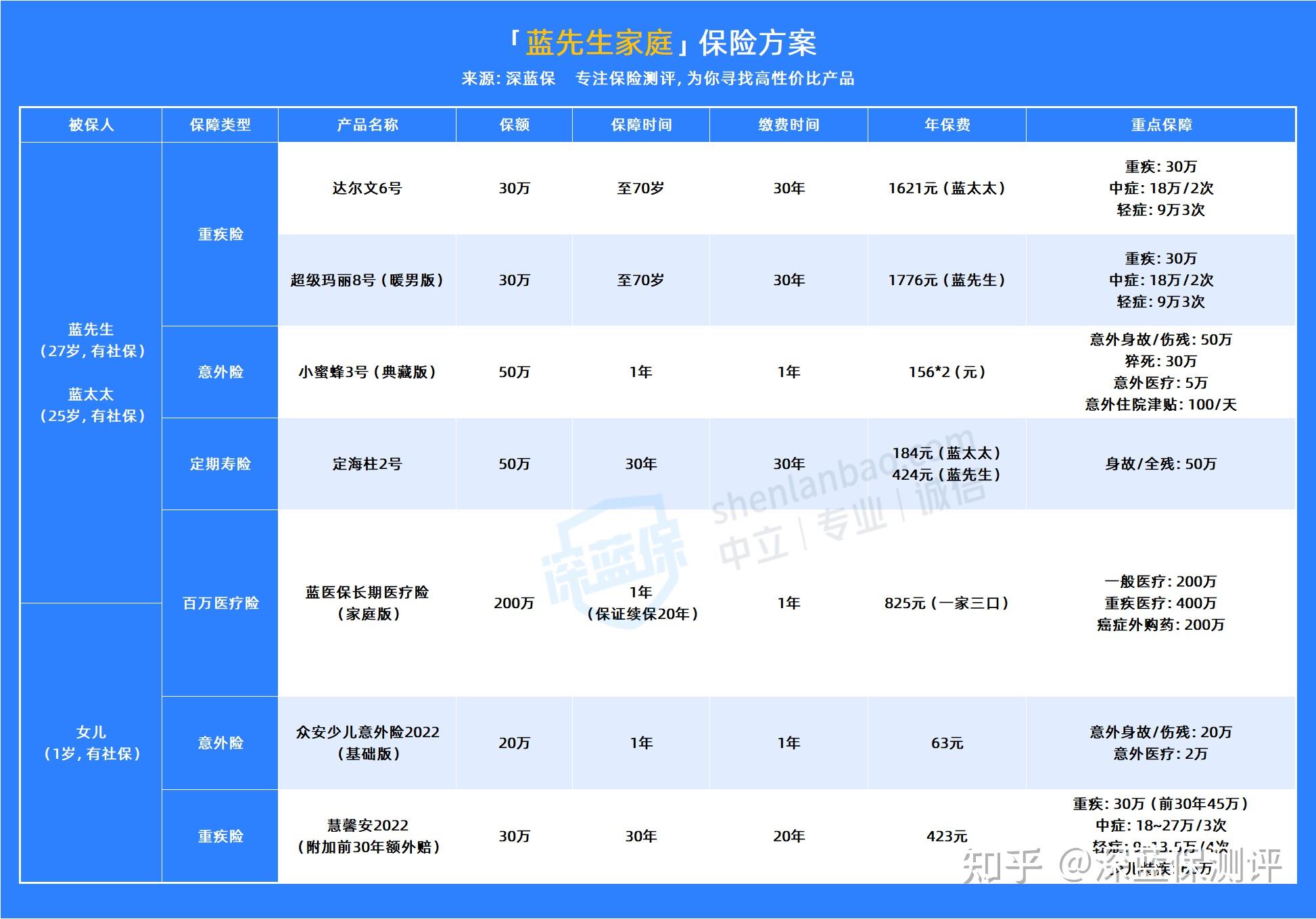 根据蓝先生一家的实际情况和预算,下面是深蓝君为他们设计的家庭保险方案: