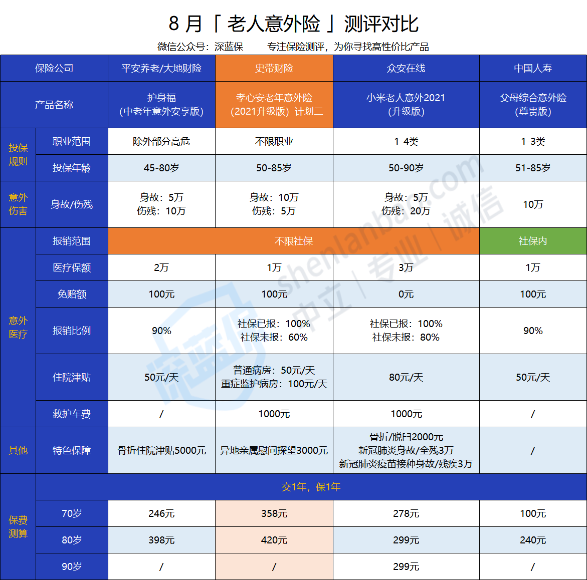 如果追求大品牌:考虑选择护身福(中老年意外安享版),保障很全面,意外医疗的报销条件不错,还有骨折住院津贴,价格不贵,性价比不错。如果给80岁以上老人投保:考虑小米老人意外2021(升级版),最高能接受90岁老人投保,意外医疗保额最高能买到5万,报销条件也非常好,价格便宜,性价比很高。Hello,这里是深蓝保旗下的测评账号,为保险产品测评而生~