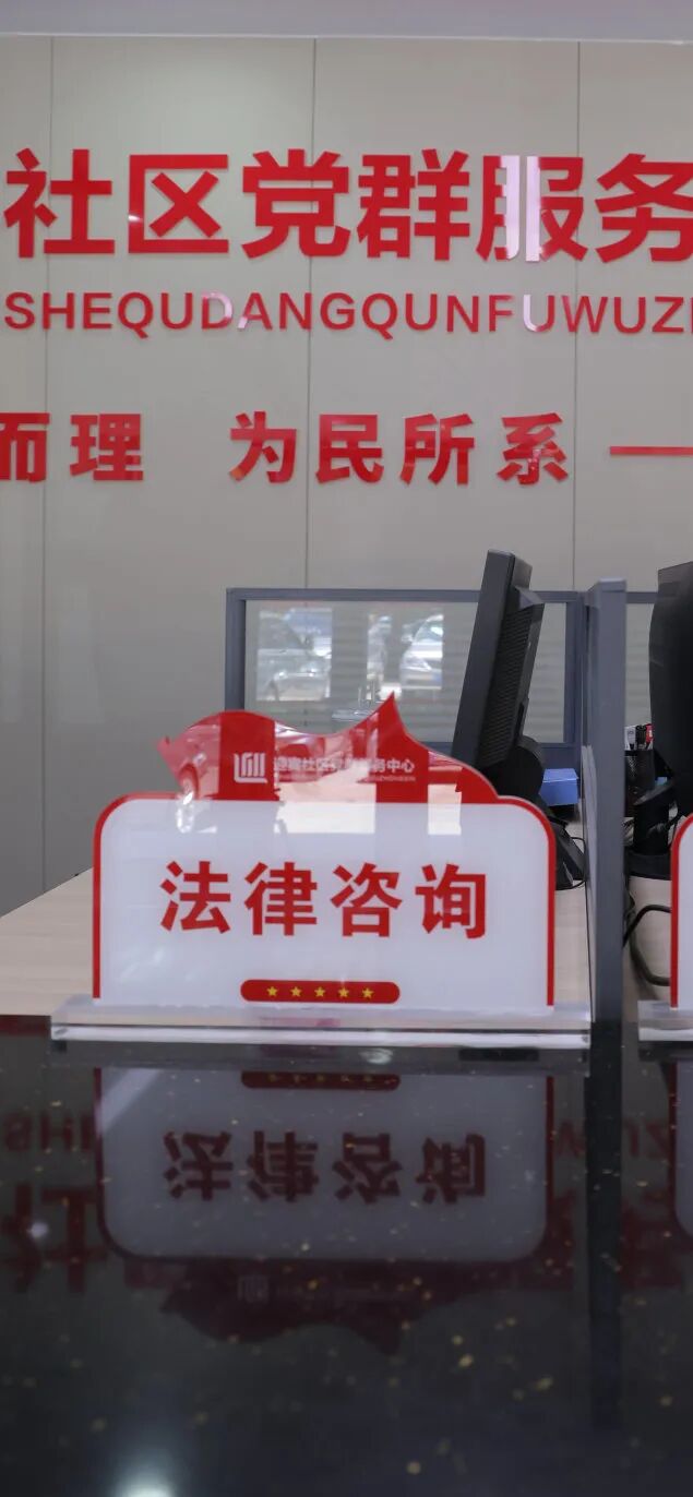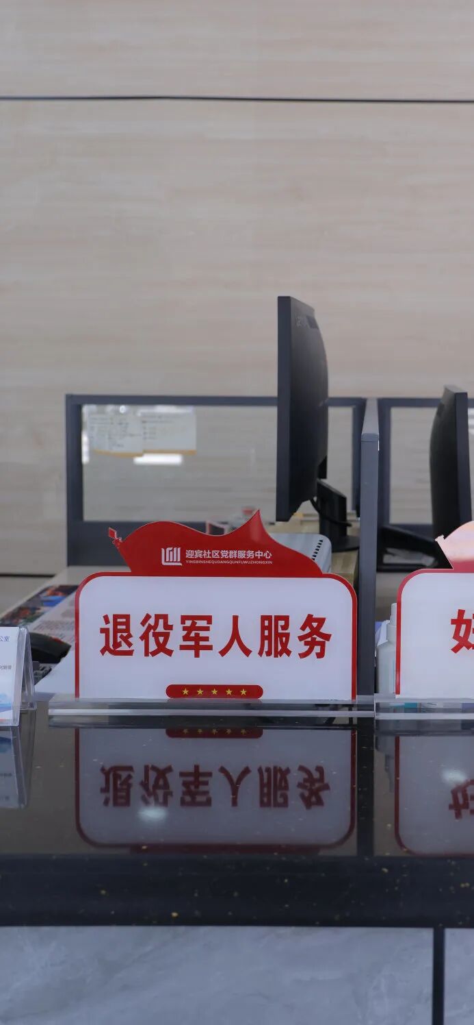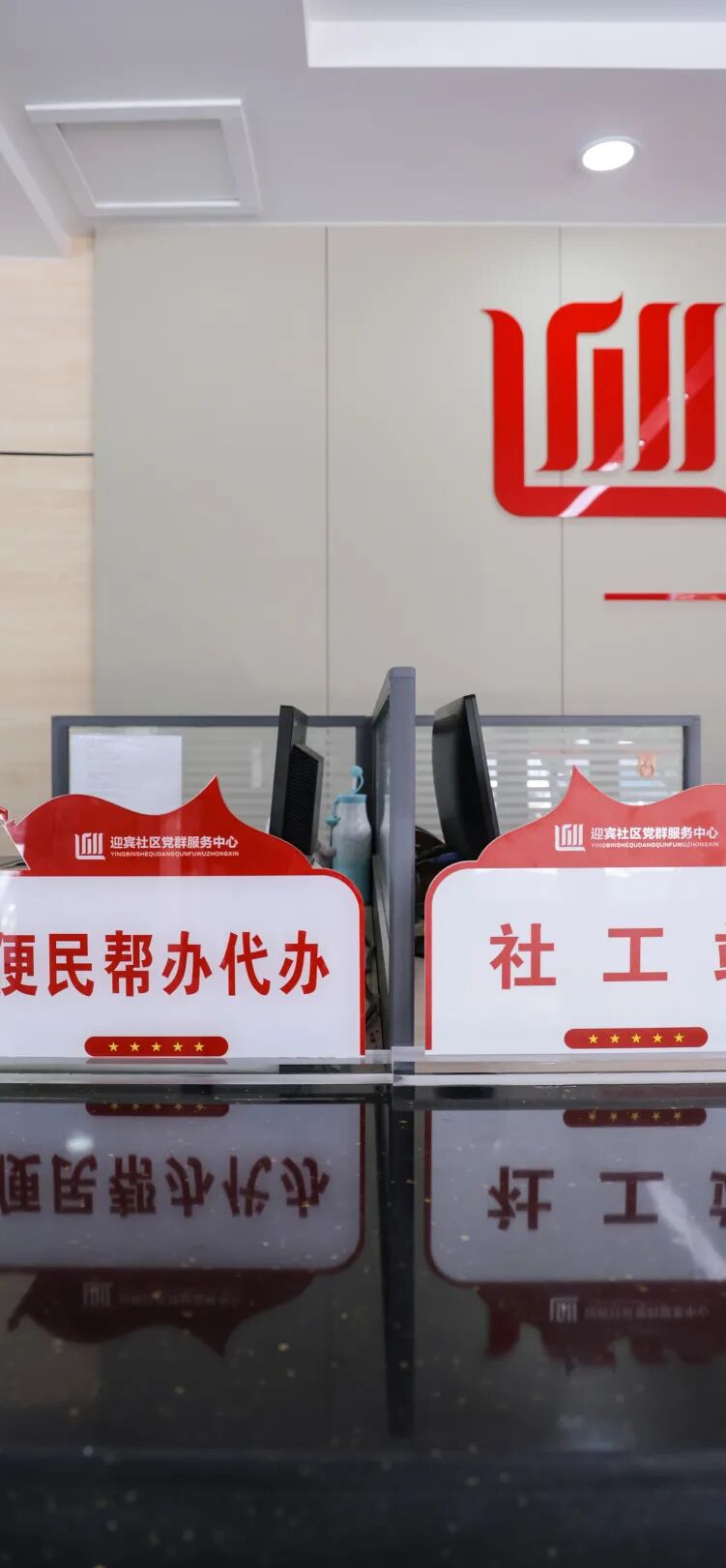 实践站内,最醒目的是服务台后的迎宾社区标志,取迎宾社区的“迎”字为元素,不仅从外形上将信念是一面旗、党员是一面旗的旗帜理念融入标志设计,更在全员的身体力行中将这一标志下“迎刃而理,为民所系”的工作理念付诸实践。