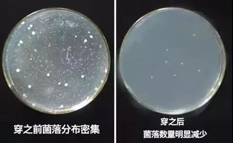 在显微镜的观察下,穿后细菌明显减少