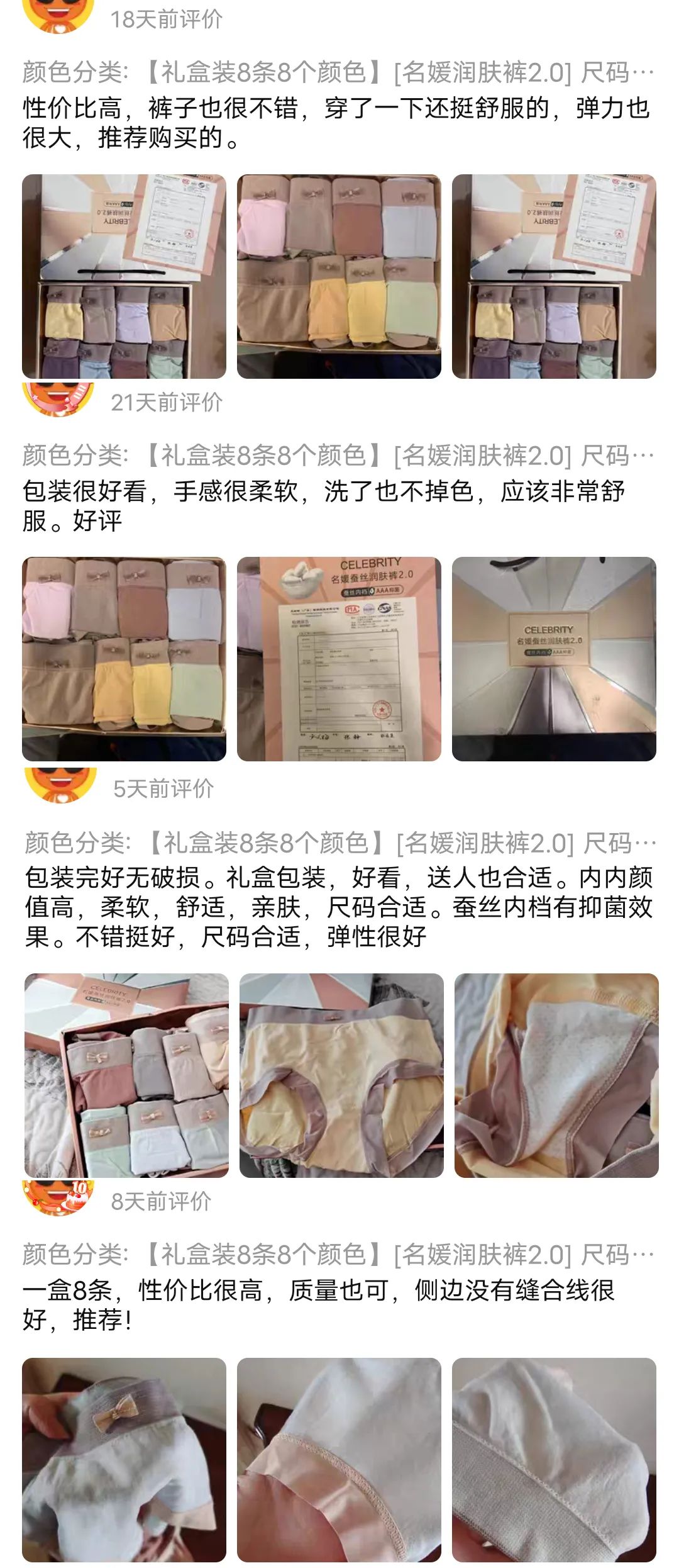 1、蚕丝内档,AAA级抑菌,吸湿透气,呵护私处健康。2、50s精梳棉材质,亲肤柔软,中腰宽边&蜜桃臀设计收腹包臀,高弹不勒。3、8条家庭装,礼盒包装,马卡龙配色,不易勾丝、不易起球。1、