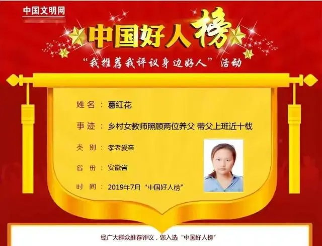 在媒体的报道下,葛红花不离不弃照顾养父的故事传遍全国,感动了无数人。2019年7月,中央文明办发布“中国好人榜”,葛红花被评为“孝老爱亲好人”,她的家庭还荣获全国“最美家庭”称号。