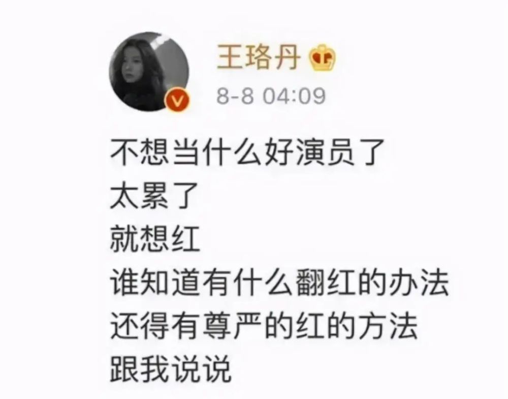 王珞丹还发了条博文说,不想当什么好演员了,太累了,就想红,谁知道有什么翻红的办法,还得有尊严的红的方法跟我说说。