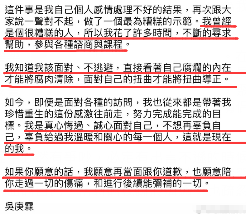 最后炎亚纶也表示,他曾经是个很糟糕的人,但他花了很多时间在寻求帮助和改变,称他是真心想要悔过,不想再辜负那些给过他温暖和关心他的人,如果邱耀文愿意的话,他想当面跟他道歉,也愿意陪他一起走过伤痛并弥补他。