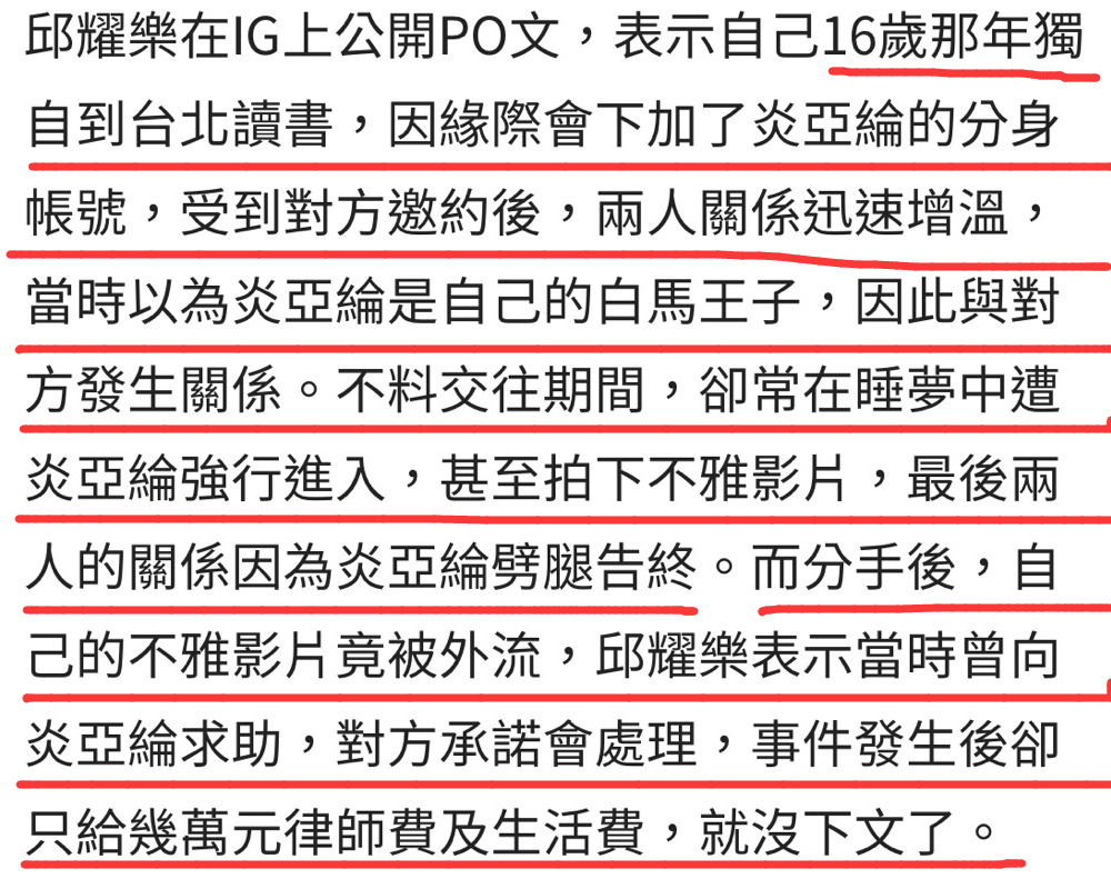 最近台湾娱乐圈有点热闹!黄子佼、大小S的事情还没有停歇,炎亚纶又出事了,台湾网红邱耀乐发文称,他16岁的时候和炎亚纶交往,但交往期间炎亚纶做了很多对不起他的事情,还劈腿出轨,并拍下两人的私密影片,但他曾对此表示强烈拒绝,炎亚纶也答应他不拍,后面不仅拍了,分手后影片还外流了,他质问炎亚纶时,他却只花了几万块钱打发他。