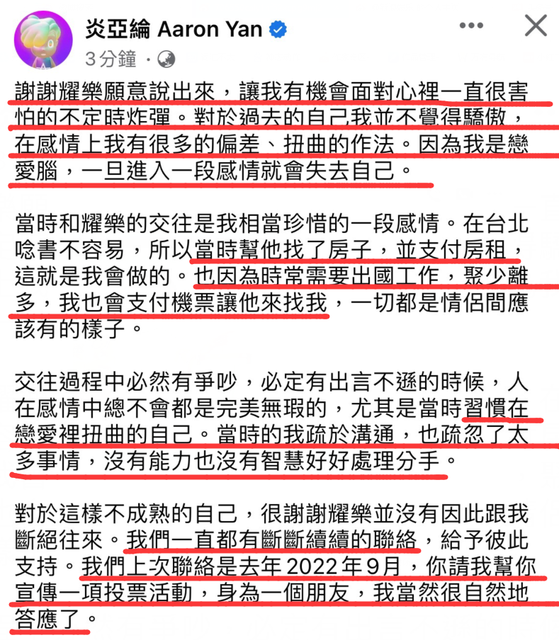 不过炎亚纶话里行间还是在为自己辩解,一再强调交往期间他为邱耀乐花了多少钱,帮他找房子,付房租,出机票钱,并表示他们之间断断续续一直有联系,而他们上一次联络是在22年9月,当时邱耀乐找他,让他帮自己宣传一项投票活动,他也照做了。